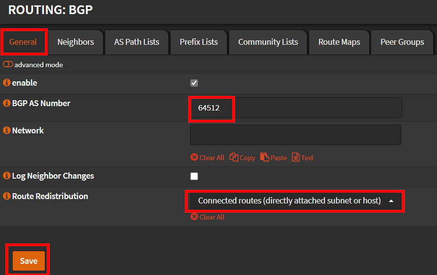 These steps will show how to configure BGP on OPNSense. However, the values used here should give you a good idea of configuring BGP on your router.